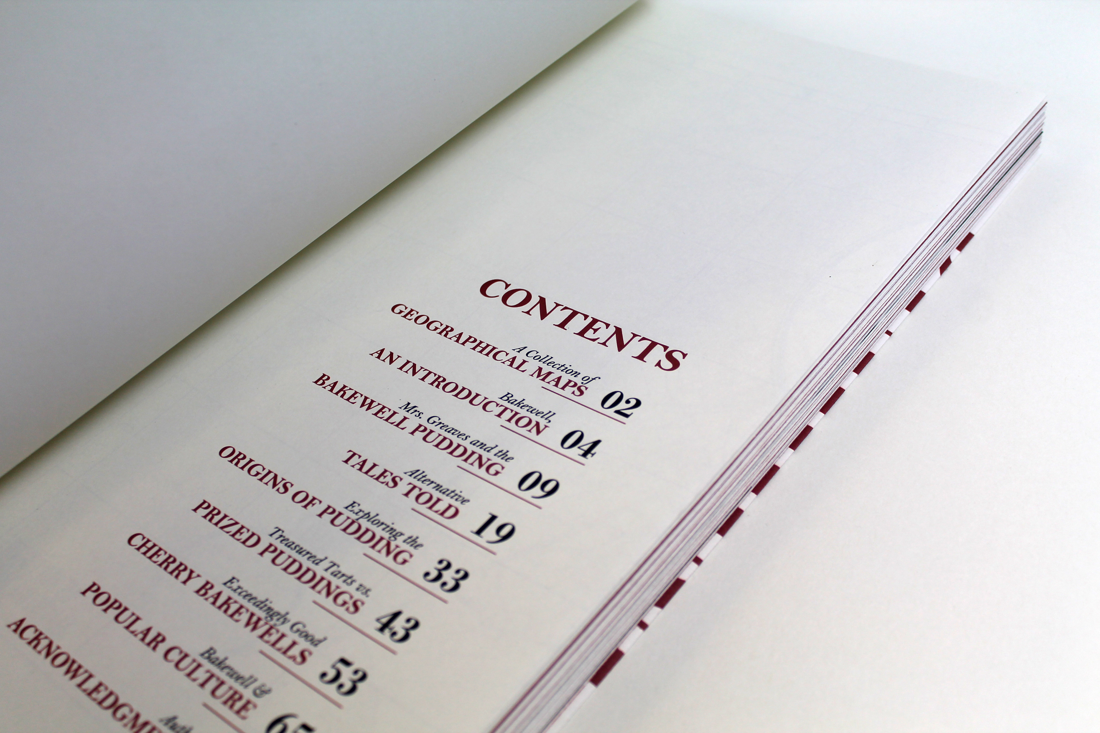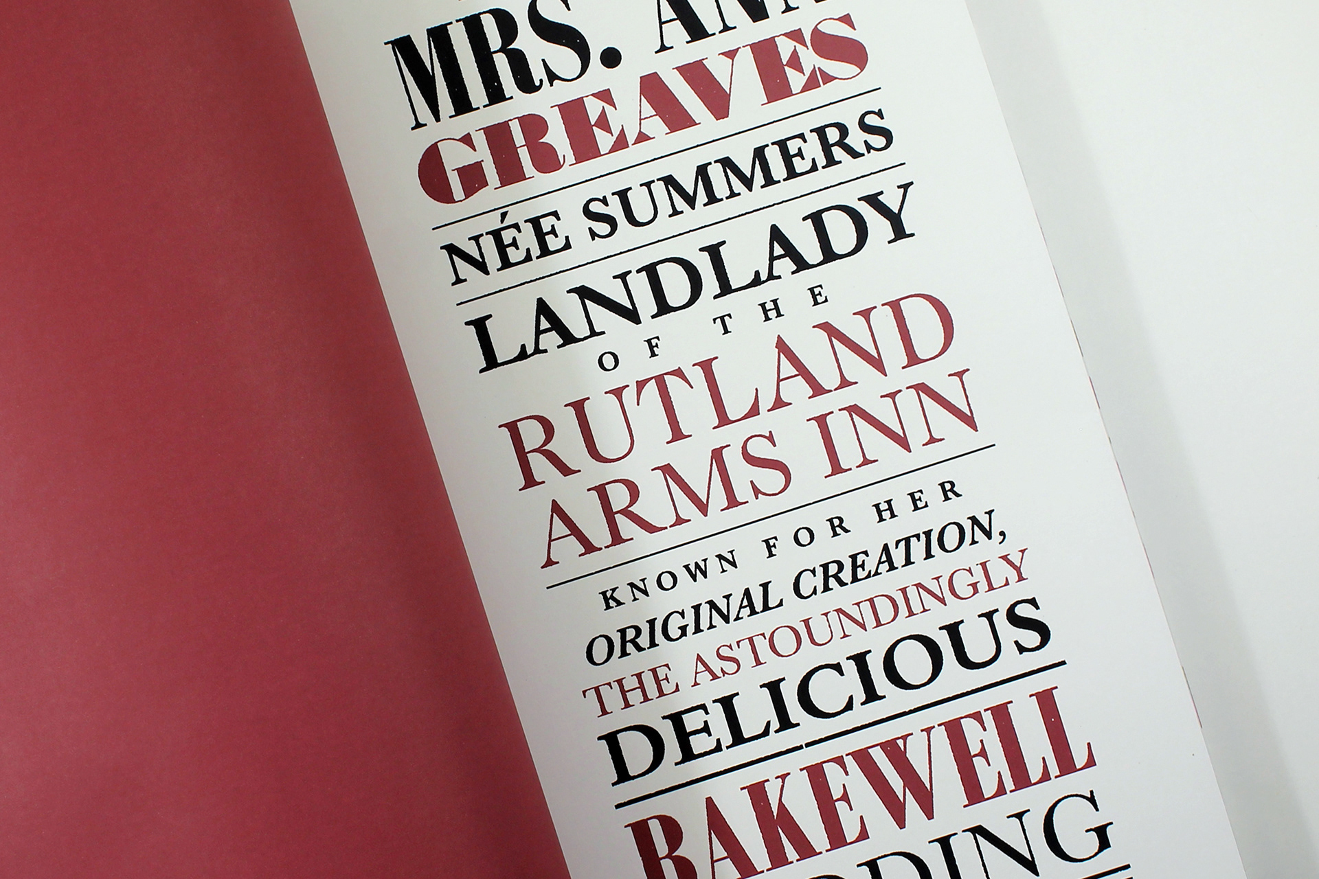 A Short Cultural & Historical Exploration of the Legendary Bakewell Pudding and its Many Modern Imitations or A Short History of the Bakewell Pudding was designed as an exploration of nineteenth century typographic design. Through the use of elaborate type design, bold colours and large scale we celebrate the Bakewell in its many forms and variations. The final result was submitted to the International Society of Typographic Designers (ISTD) who conducted an in-depth assessment of my typographic skill. The assessment looked into my research, self-reflection, design strategy and development as well as the technical and production specification to accompany my book. The ISTD deemed that I had reached the high standard to qualify for membership of the Society.