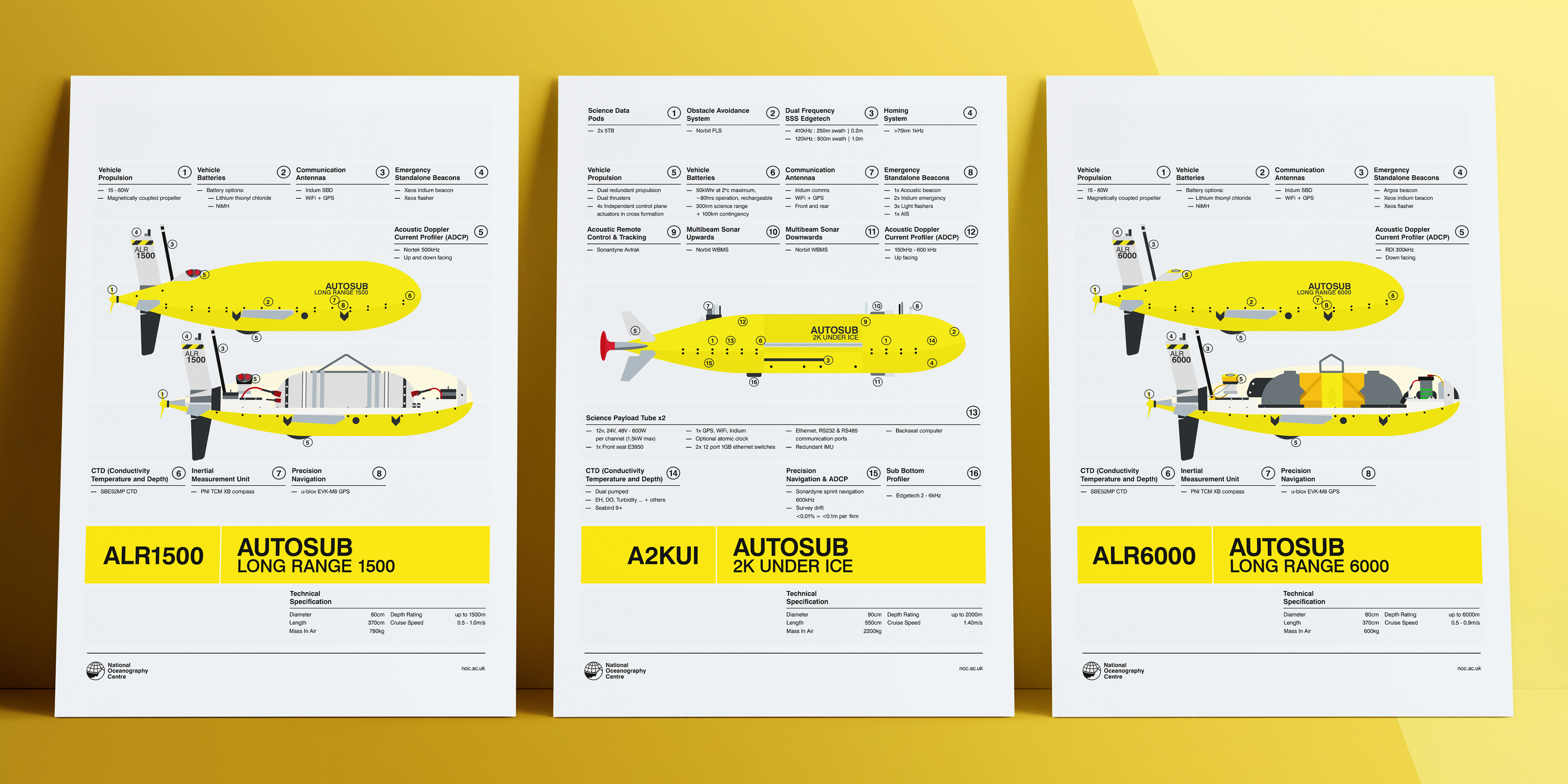 The National Oceanography Centre is an industry leader in marine autonomous technology development with over twenty years of experience. A central part of this is the development of Marine Autonomous Robotic Systems (MARS) such as the Autosub Long Range, known as Boaty McBoatface. An ongoing series of posters have been produced to showcase scientific missions undertaken, the intricate workings of individual robotic vehicles and the extensive range of gliders and attachments. The designs of the posters are inspired by the technical aspects of the robotic development, utilising a visual grid system, flat diagrammatic illustrations and clear bold highlights. The series were designed as beautiful posters but also functional documents for the partners and the teams, aiding in comparing and contrasting capabilities and functions.