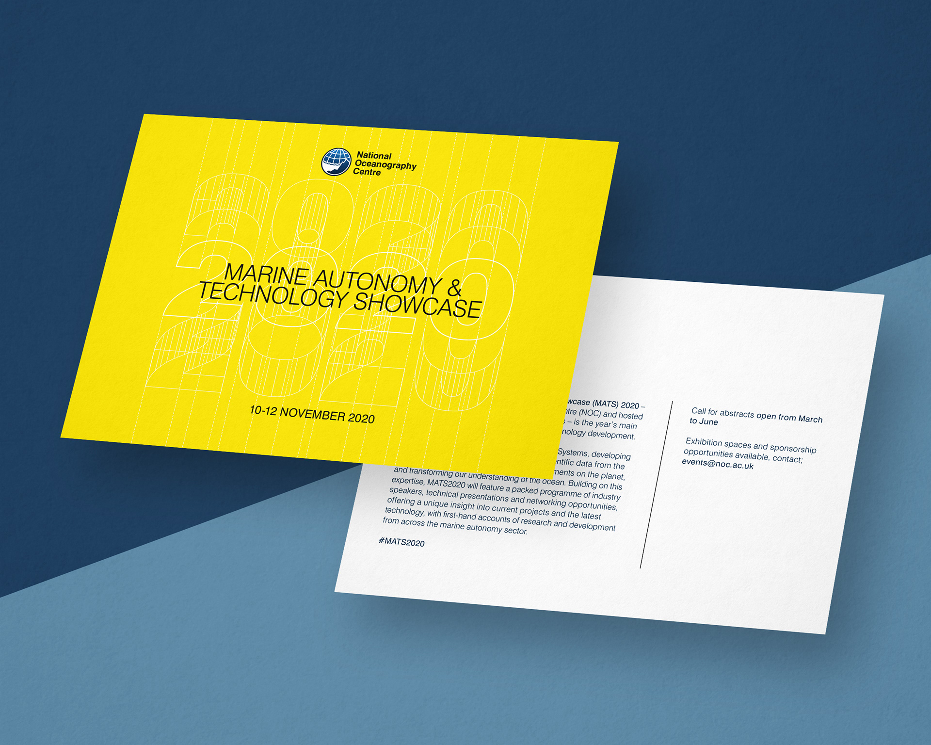 Each November the National Oceanography Centre hosts the Marine Autonomy & Technology Showcase (MATS). The three day event houses exhibits from the NOC and partners, presentations from leading industry, academia and government figures, as well as a broad range of panel discussions and networking opportunities. The 2020 branding builds upon the recognisable yellow and black designs of previous years but with motion at its heart. Designed to be a moving wallpaper, the blueprint inspired design is compiled before your eyes to reveal the date and lead you into the virtual conferences and videos that were produced for the event. The design was used extensively across literature, promotional material, social media as well as video and presentations. When the event was switched to virtual due to COVID-19 the design was used throughout the online portal and downloadable promotional material.