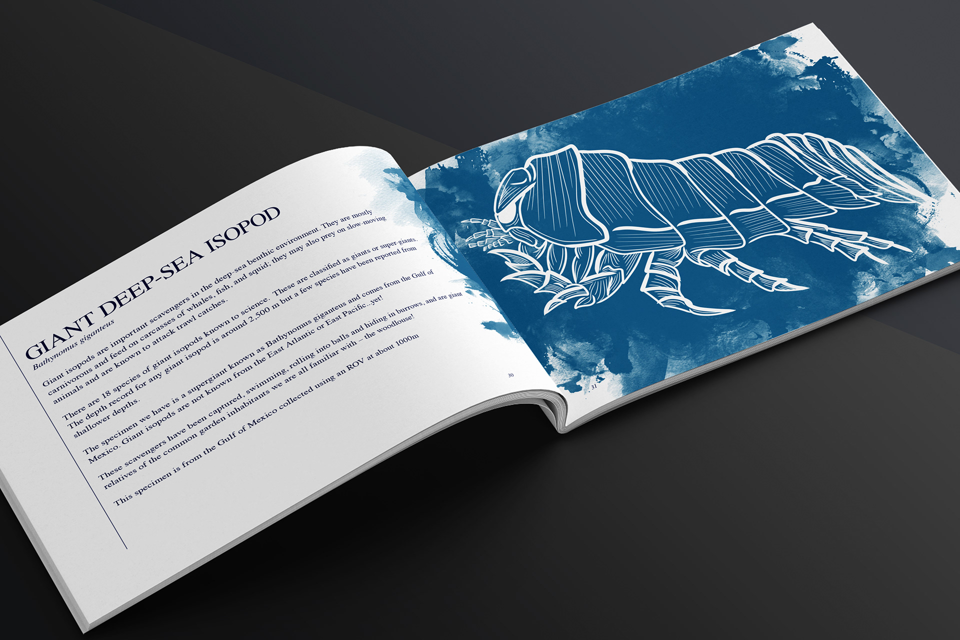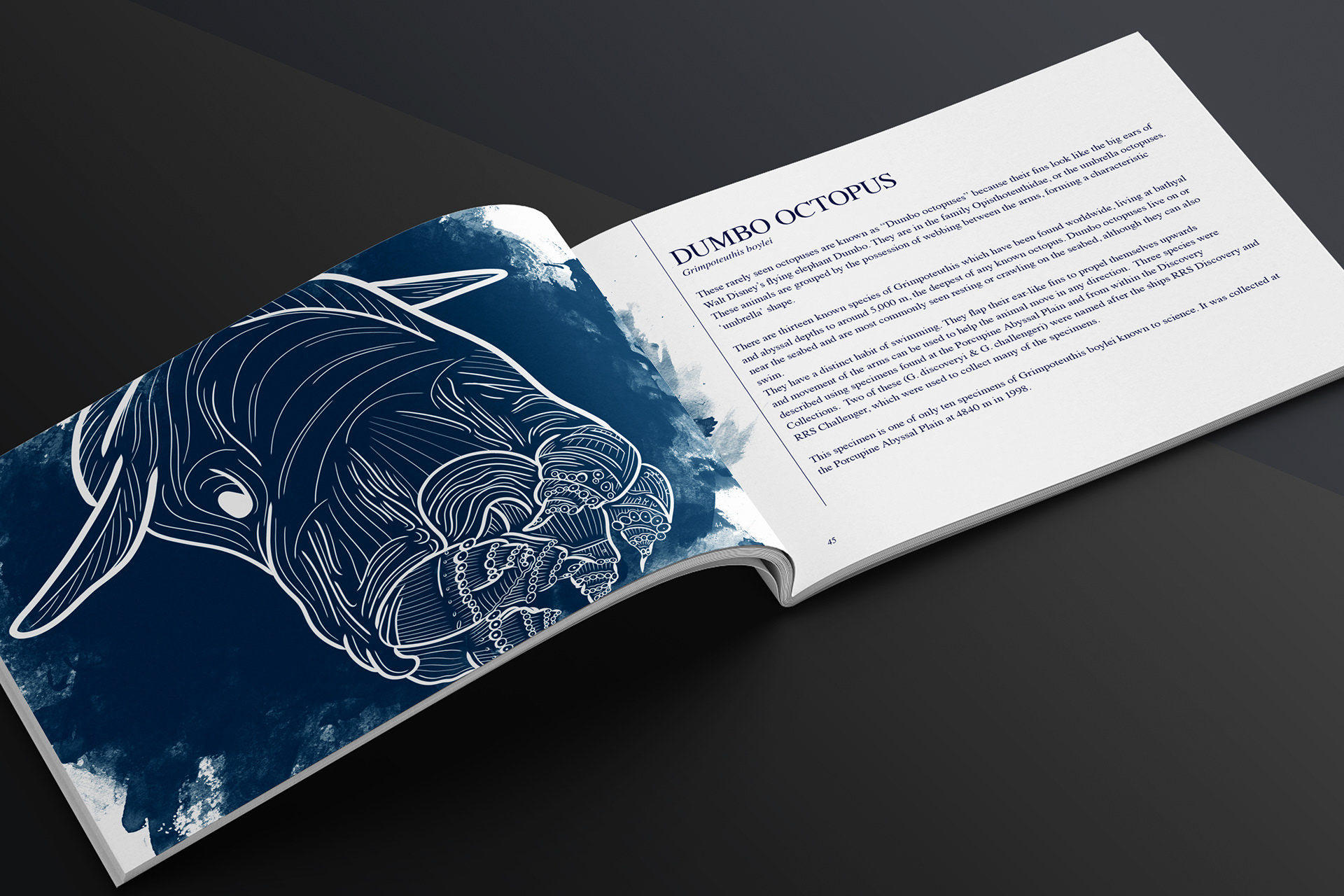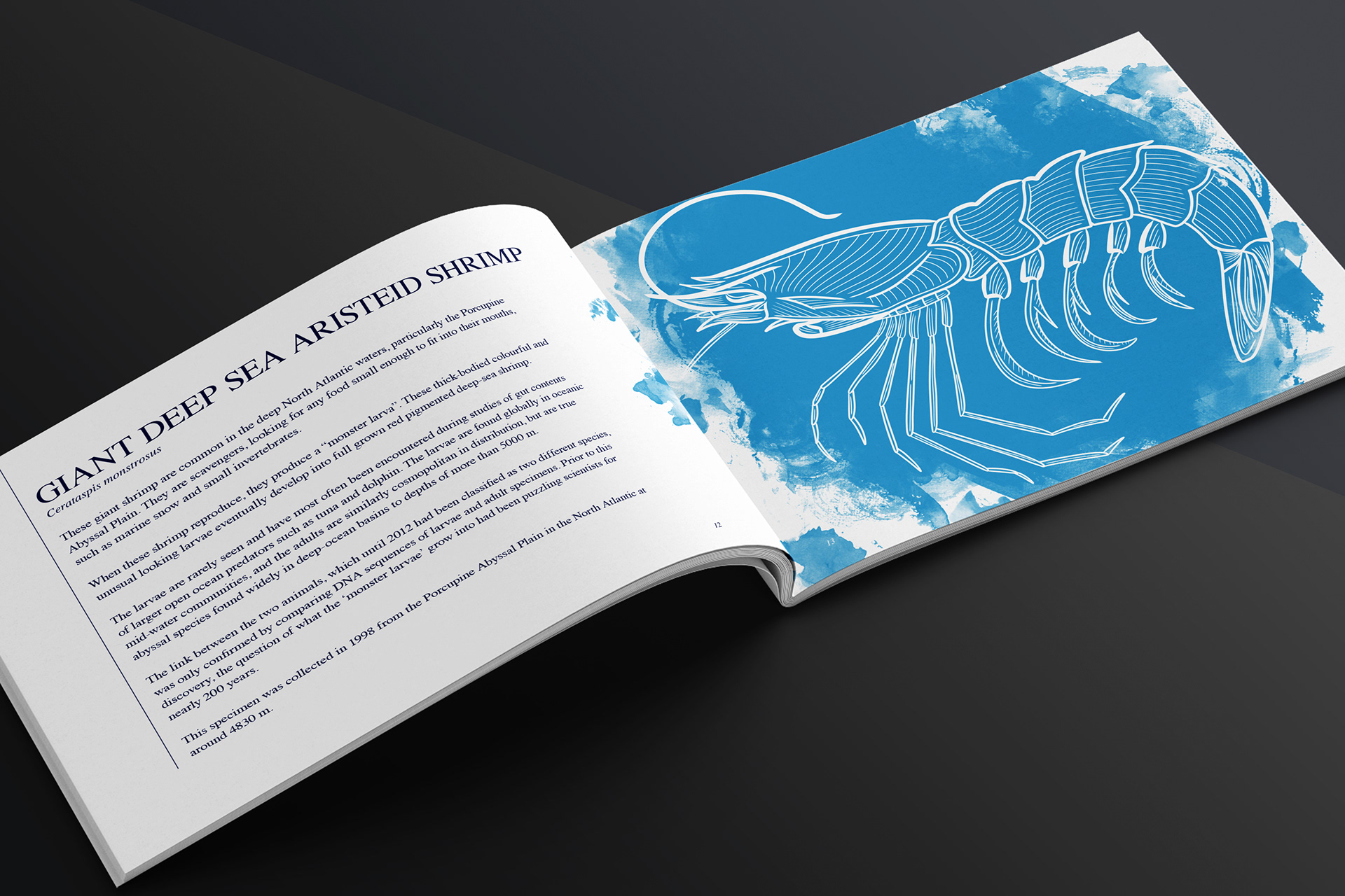 The Discovery Collections house the only collection consisting solely of deep-sea and open-ocean invertebrates in the UK, collected from many areas of the world’s oceans starting in 1925. Within this collection are thirteen star specimens which were selected to be featured in the National Maritime Museum Cornwall’s (NMMC) exhibition “Monsters of the Deep”. I worked with the manager of The Discovery Collections, Dr Tammy Horton, to learn more about the specimens, researching their key characteristics and unique traits in order to illustrate each one to be featured in video content, on our website and in print. The illustration style was inspired by Victorian wood carvings, leaning heavily into early horror genre aesthetics throughout the project. The illustrations were made for the NOC but requested by the NMMC to form part of the exhibition materials that accompany the specimens. The Monsters are presented here in the booklet, the rough watercolour backgrounds gradually get darker throughout the booklet, this subtle colour change indicates the depth of the monster as they all come from different depth in the deep sea.