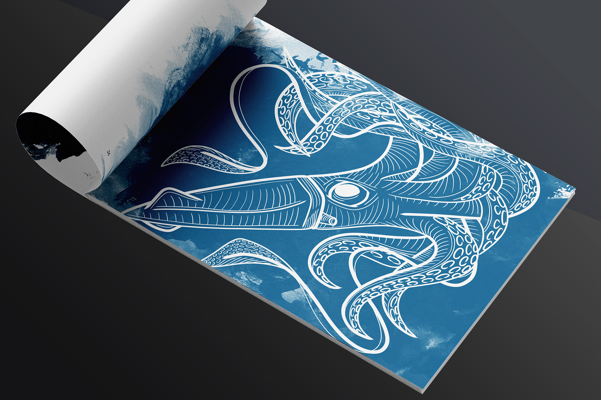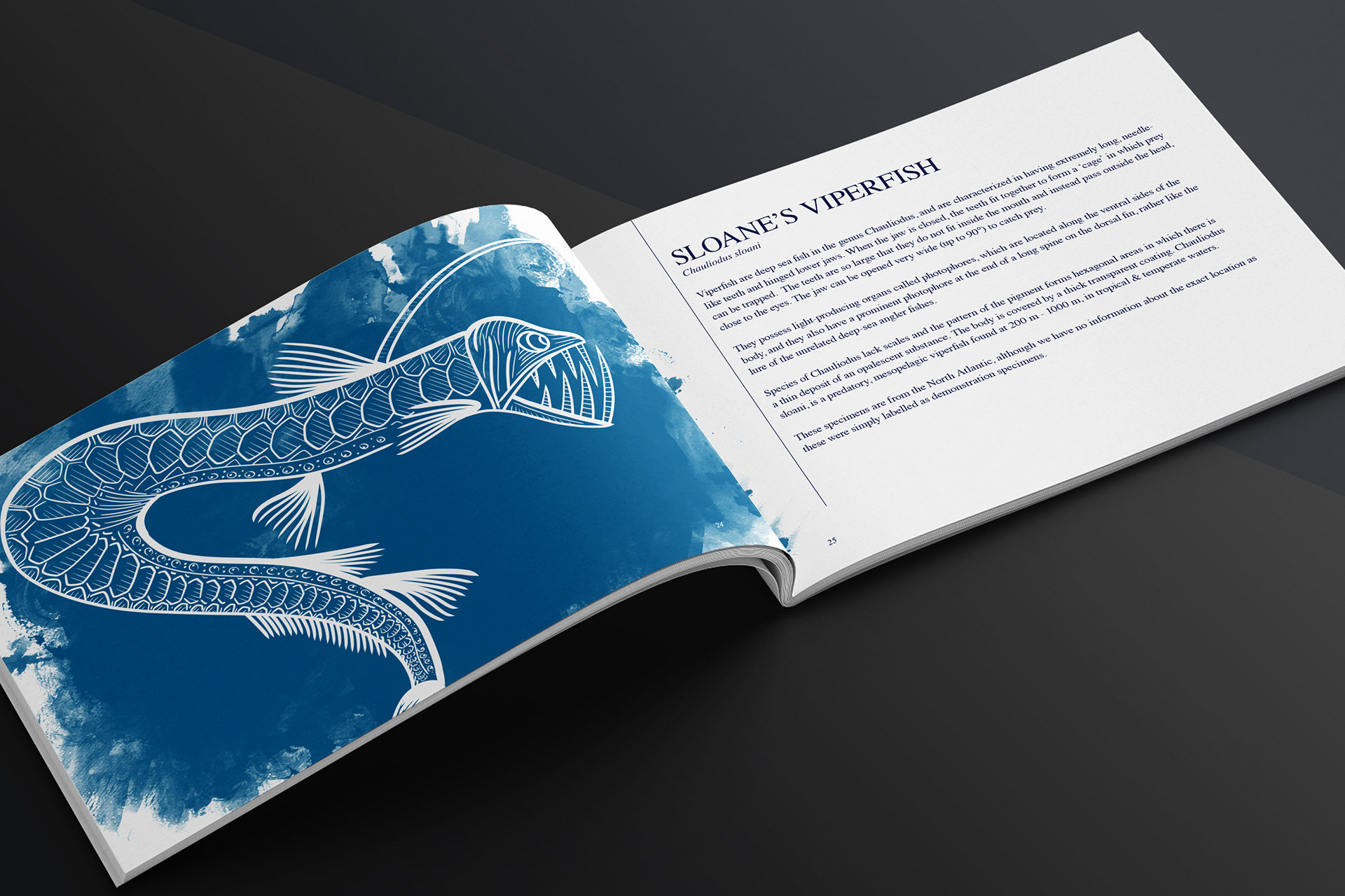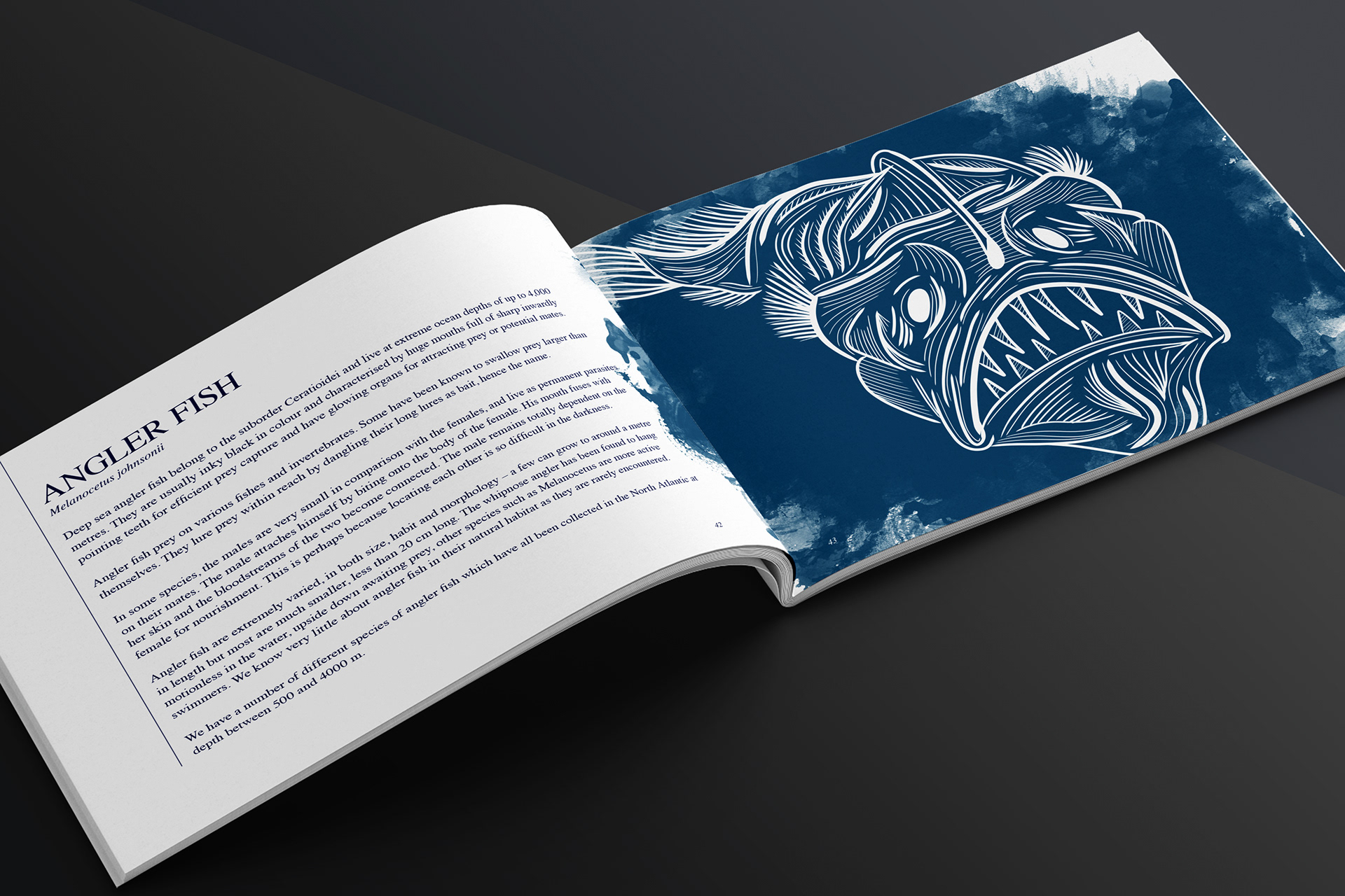 The Discovery Collections house the only collection consisting solely of deep-sea and open-ocean invertebrates in the UK, collected from many areas of the world’s oceans starting in 1925. Within this collection are thirteen star specimens which were selected to be featured in the National Maritime Museum Cornwall’s (NMMC) exhibition “Monsters of the Deep”. I worked with the manager of The Discovery Collections, Dr Tammy Horton, to learn more about the specimens, researching their key characteristics and unique traits in order to illustrate each one to be featured in video content, on our website and in print. The illustration style was inspired by Victorian wood carvings, leaning heavily into early horror genre aesthetics throughout the project. The illustrations were made for the NOC but requested by the NMMC to form part of the exhibition materials that accompany the specimens. The Monsters are presented here in the booklet, the rough watercolour backgrounds gradually get darker throughout the booklet, this subtle colour change indicates the depth of the monster as they all come from different depth in the deep sea.