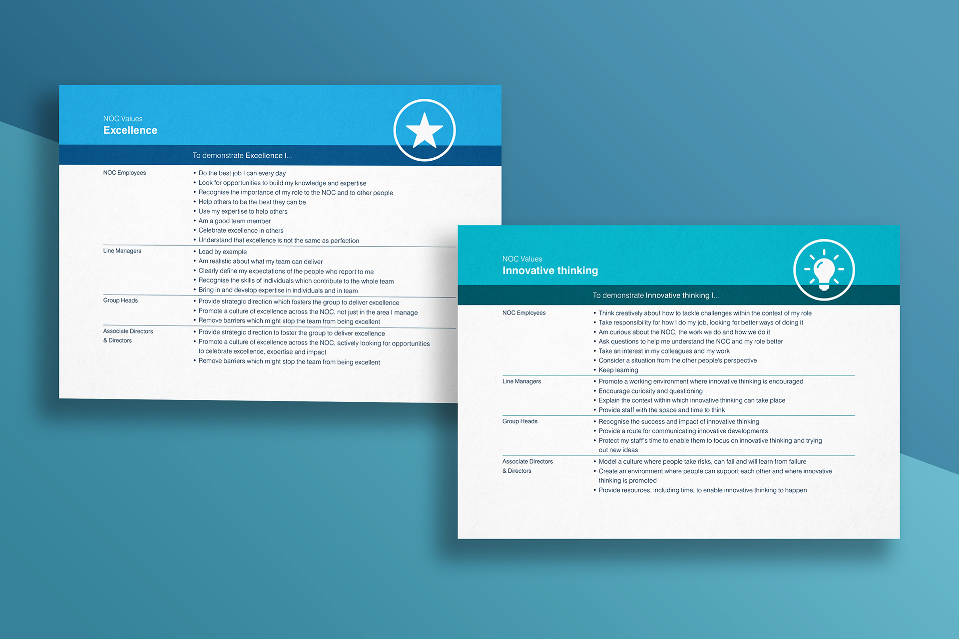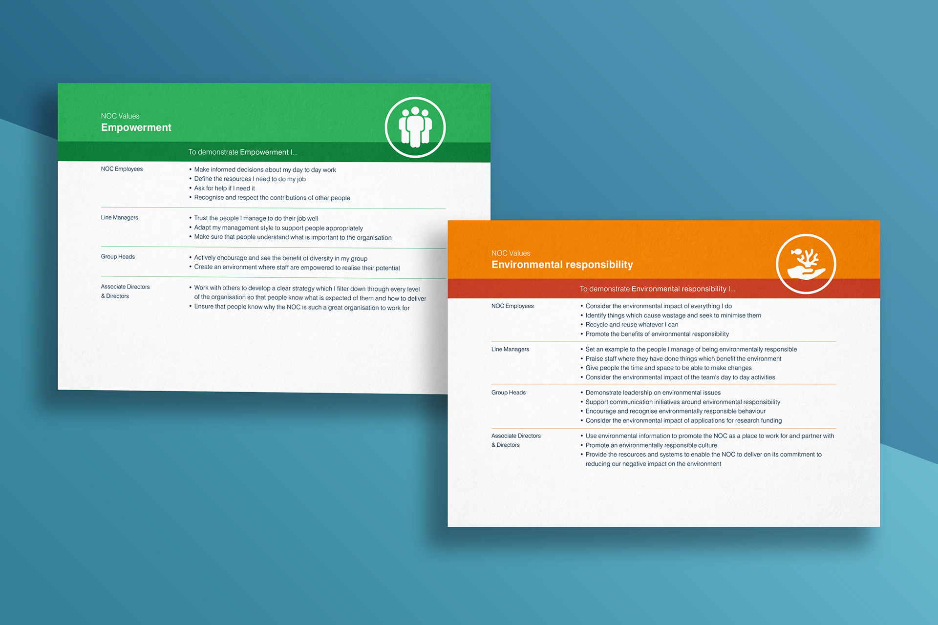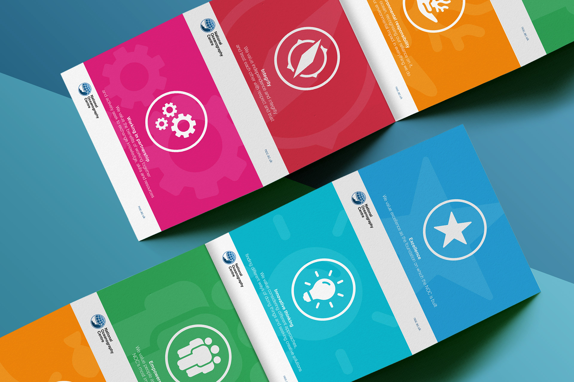 The National Oceanography Centre has six corporate values; Excellence, Innovative Thinking, Empowerment, Environmental Responsibility, Integrity and Working In Partnership. The shared values were reached through wide discussion and guide what we do, how we do it and the decisions we make. The values are used extensively throughout the NOC’s communications, both internally and externally in print, signage and video, so it is vital that they are distinctive in their appearance but always feel fresh and exciting. To enhance the values, I gave the icons a slight update in 2020. The new icons are based on the original icons which were designed before I joined but were simplified in places, rebalanced throughout to be much bolder and given a new expanded colour palette. The new colours are part of a wider effort in the NOC to introduce more accessible design, these new colours come in three shades for different applications.