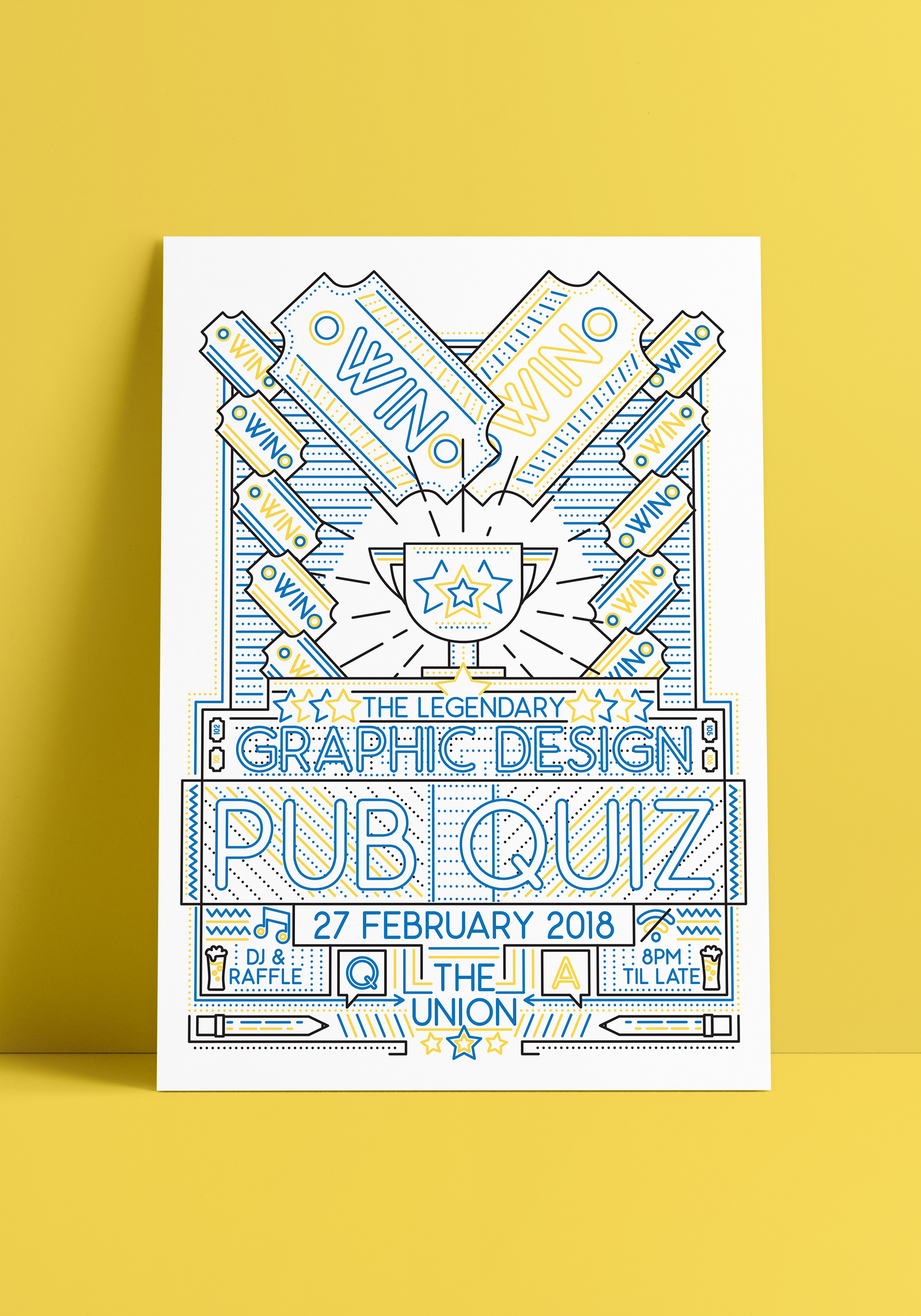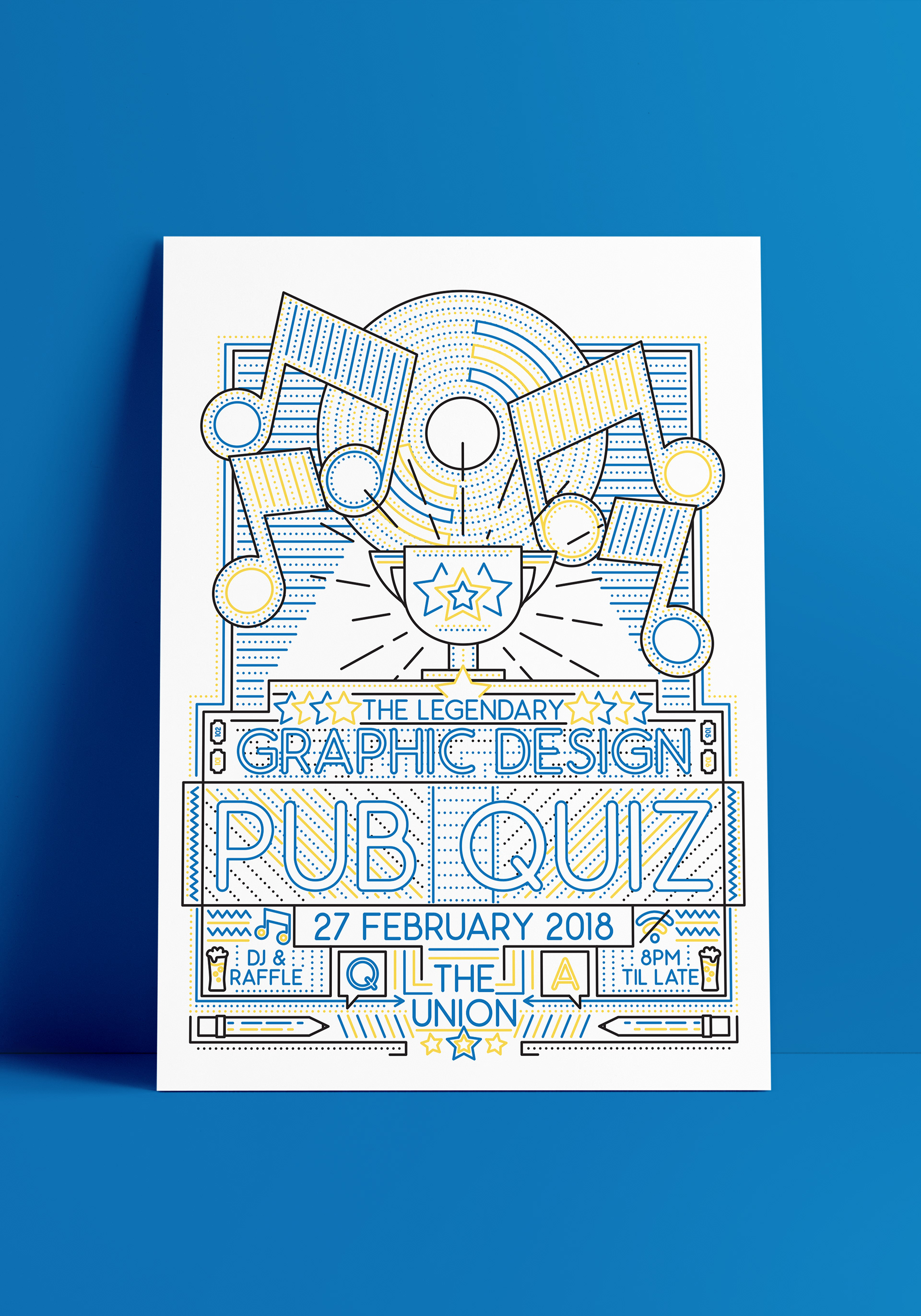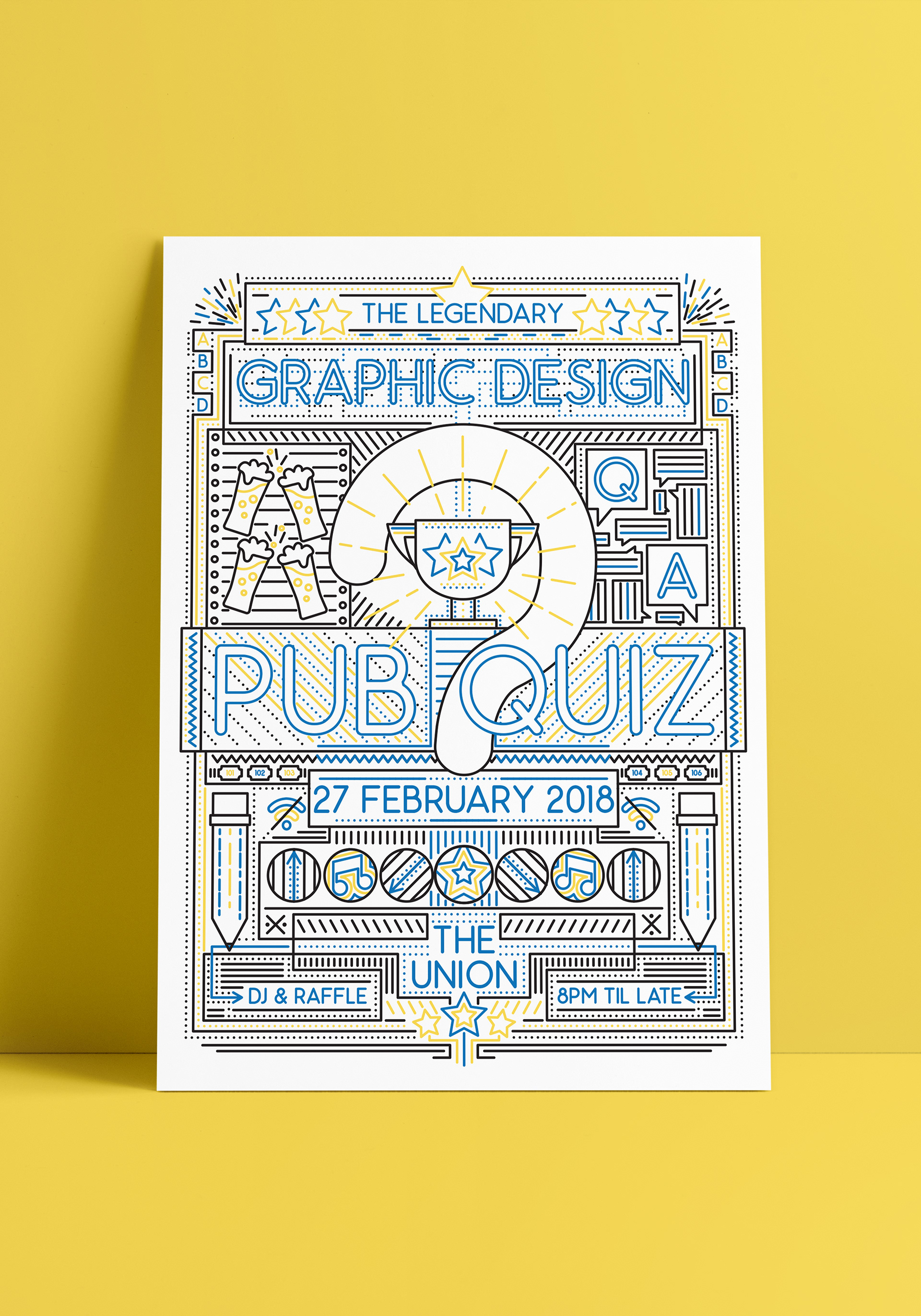 Each year the University Of Portsmouth Graphic Design students host a pub quiz to raise funds for to attend D&AD New Blood, the quiz has a legendary status amongst the staff, student and alumni. Inspired by this legendary status, I created my own series of posters trying to encapsulate the energy and enthusiasm we all share for the event. The pun quiz is known for not only it’s difficult questions but the epic raffle prizes as well as music and liberal drinking. My series of posters aimed to advertise each aspect of the event to appeal to the wide audience who engage with the event for different reasons. The designs became an intricate yet bold statement with highly coded imagery to dissect and discover.