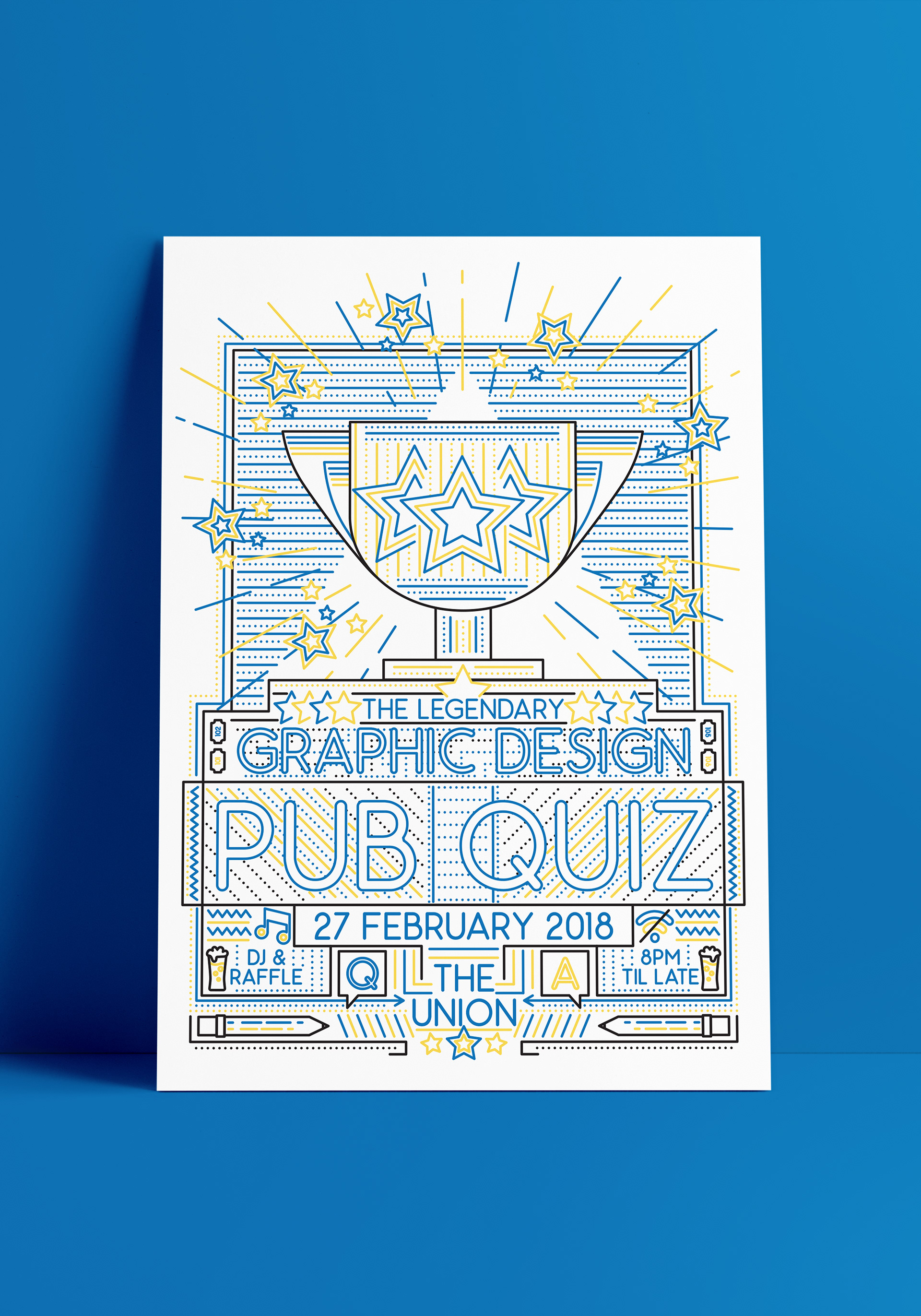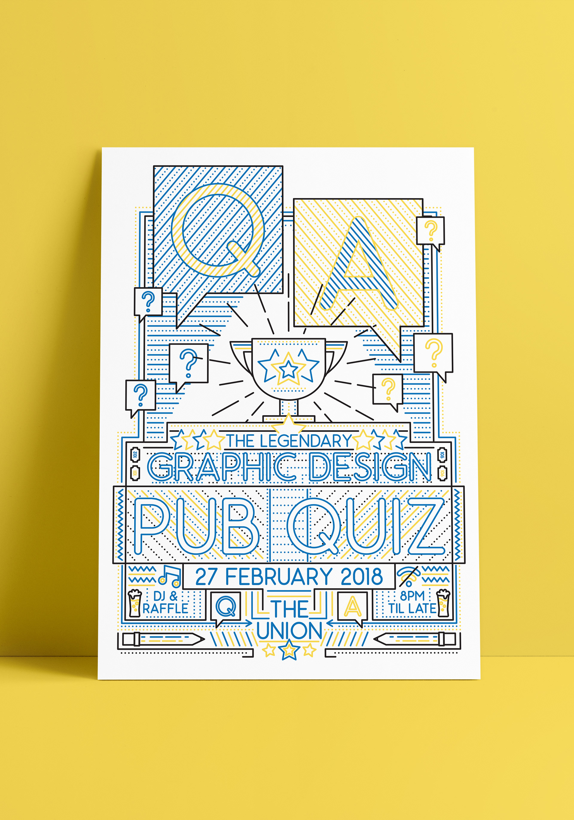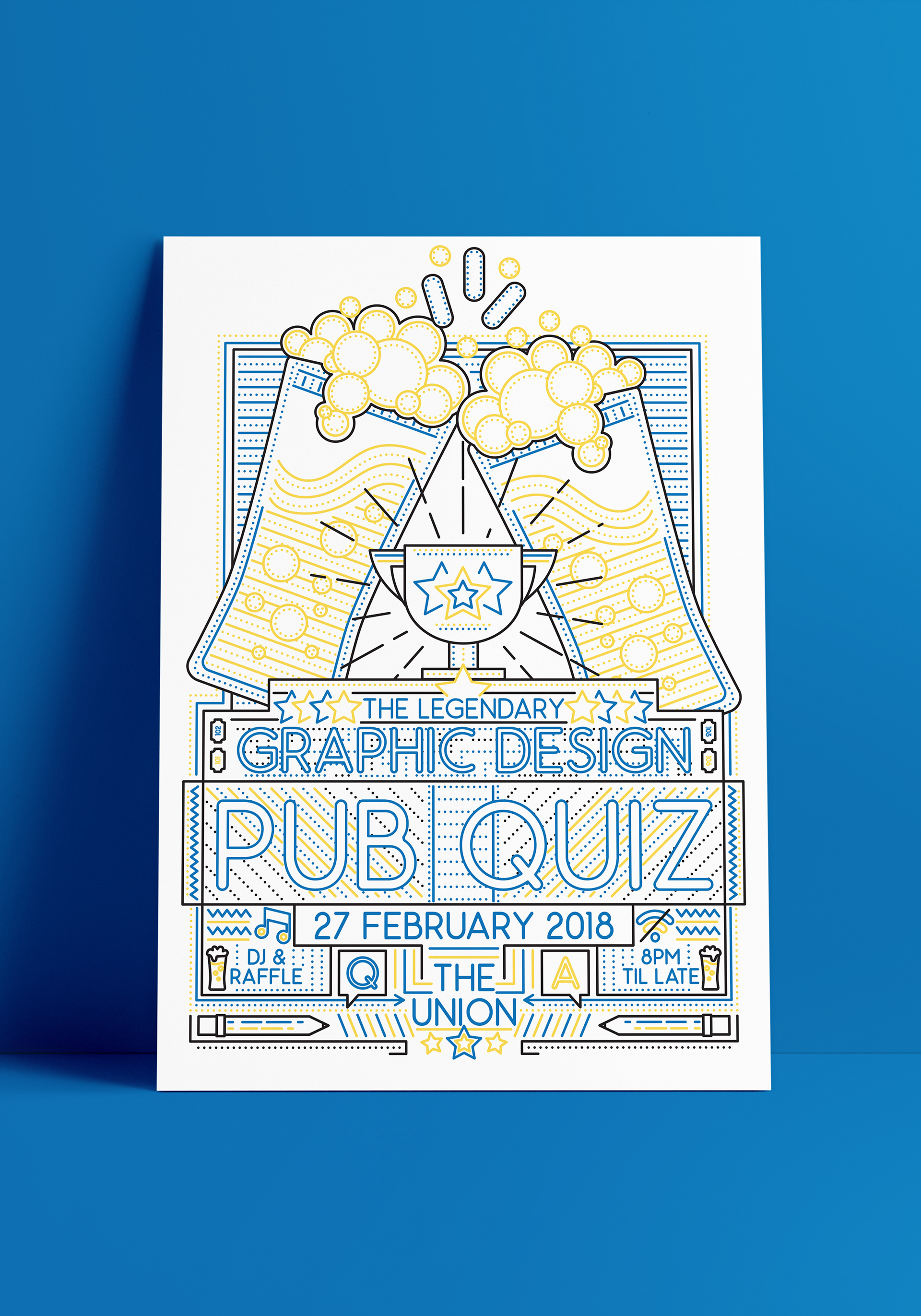 Each year the University Of Portsmouth Graphic Design students host a pub quiz to raise funds for to attend D&AD New Blood, the quiz has a legendary status amongst the staff, student and alumni. Inspired by this legendary status, I created my own series of posters trying to encapsulate the energy and enthusiasm we all share for the event. The pun quiz is known for not only it’s difficult questions but the epic raffle prizes as well as music and liberal drinking. My series of posters aimed to advertise each aspect of the event to appeal to the wide audience who engage with the event for different reasons. The designs became an intricate yet bold statement with highly coded imagery to dissect and discover.