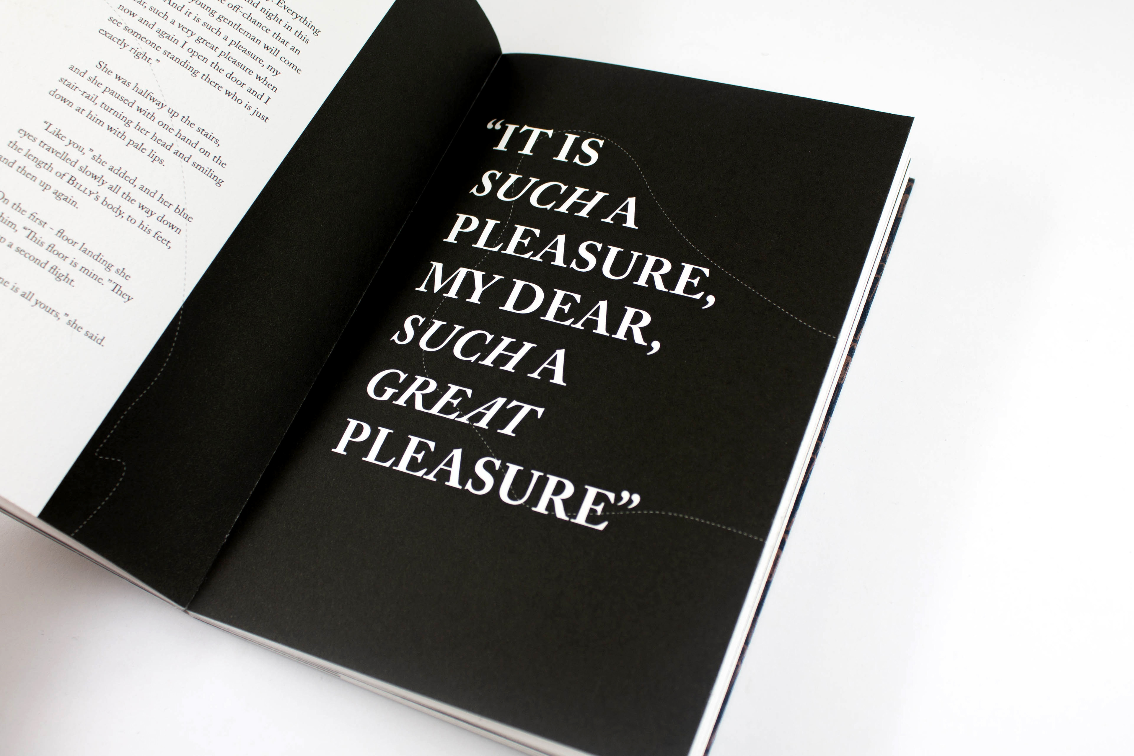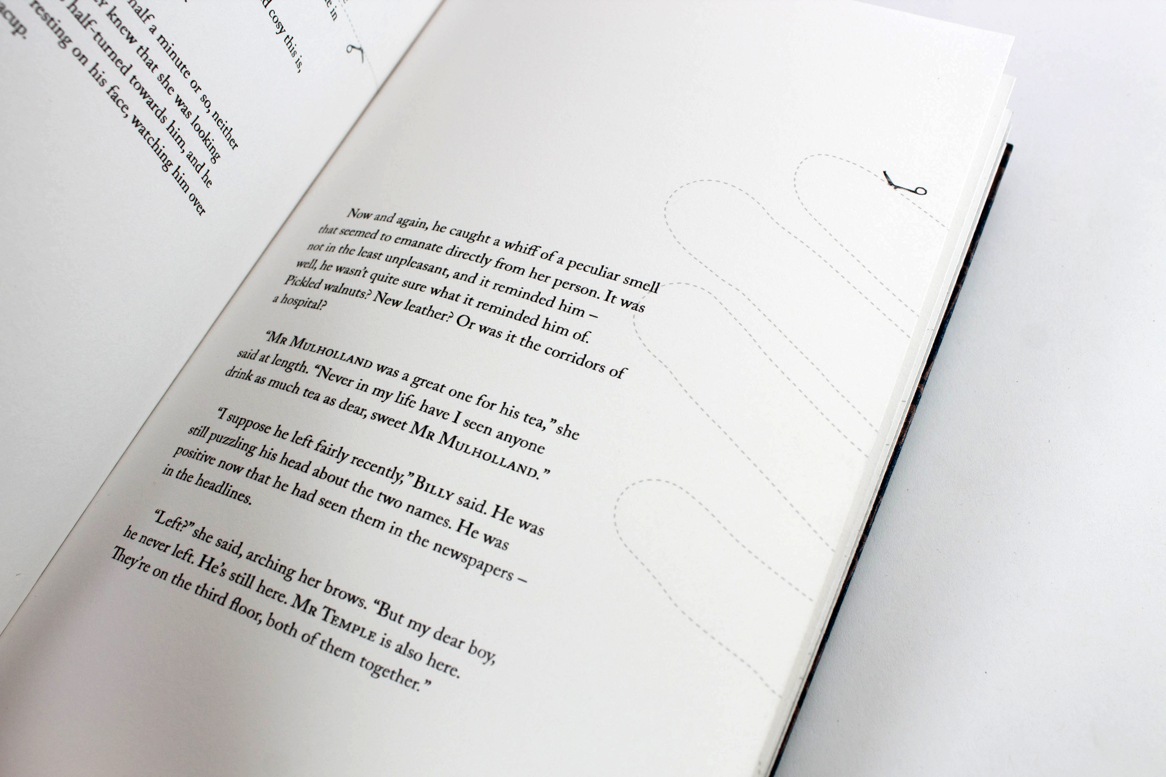 The Landlady is a dark tale of an innocent young man who means a terrible end in the hands of the landlady. Throughout the book you are given subtle hints that she is going to kill him and preserve his body with taxidermy. The design of my book is the living embodiment of this story, throughout the book are abstract lines that weave through the narrative, as you gradually become aware of the landlady’s intentions the lines become ever clearer until you’re meant with the grim realisation that the book itself is designed to be preserved. You must then re-read the story as you are encouraged to re-examine what you have read as you carefully rip the pages from the spine, cut along the lines and piece together the body within the pages.