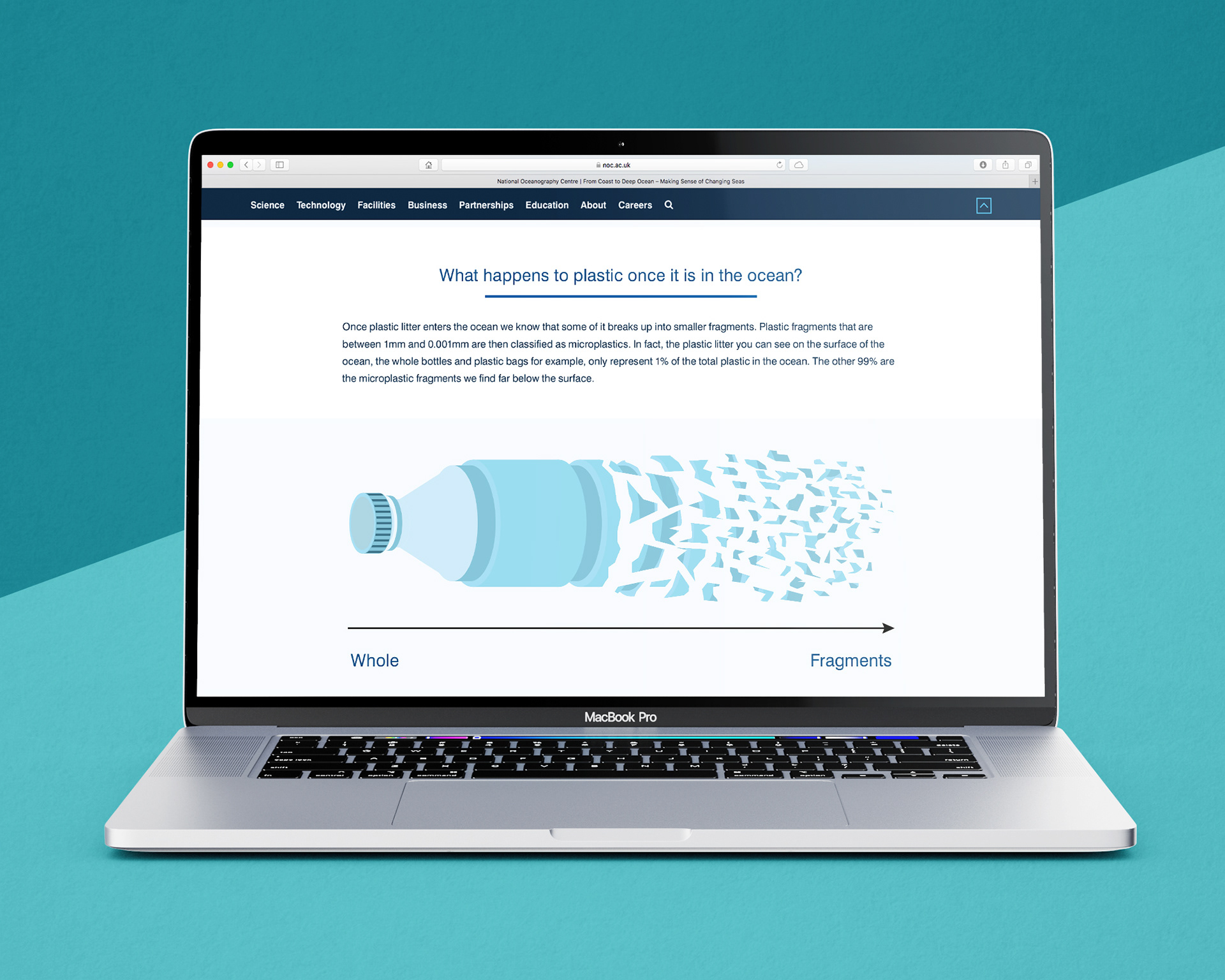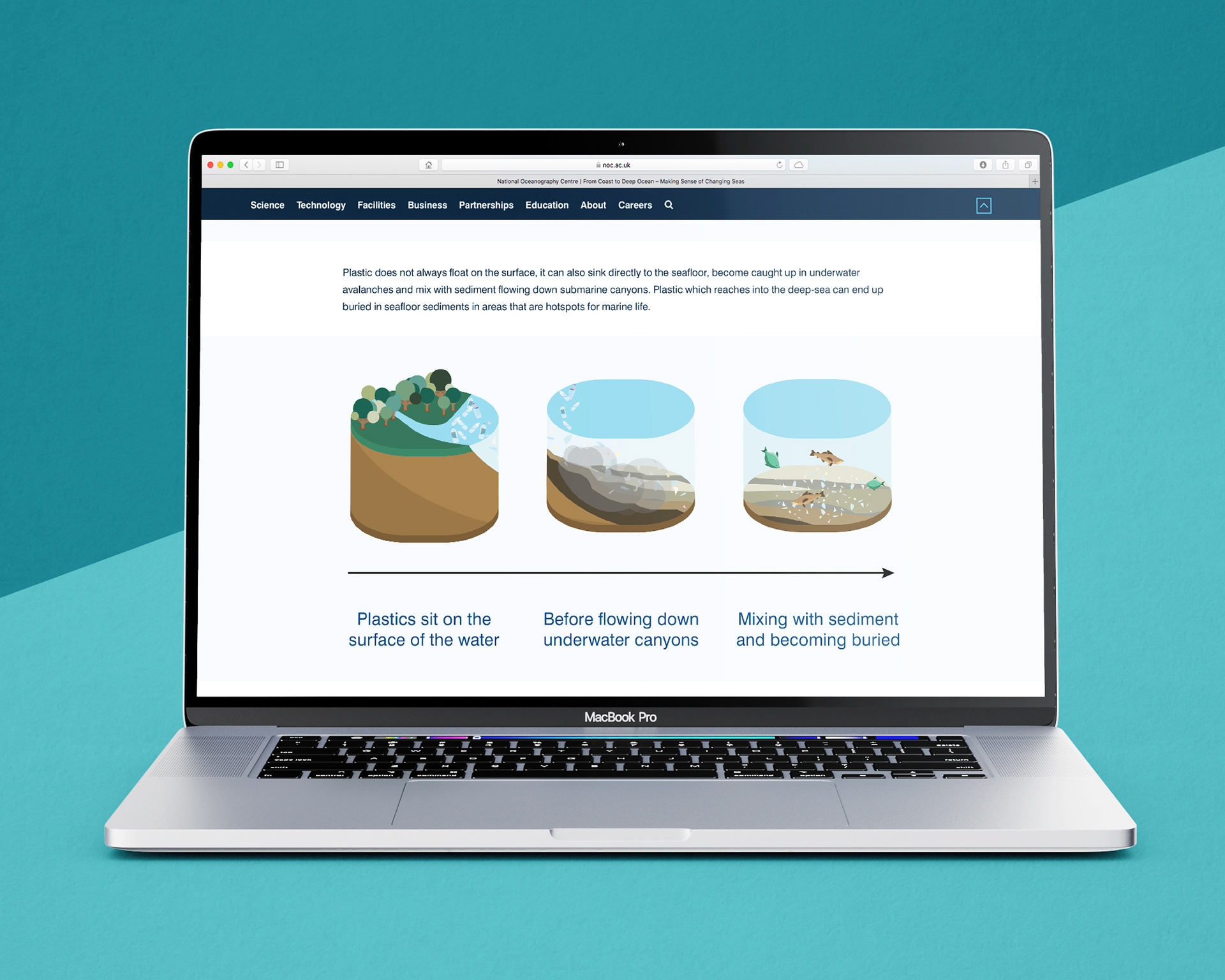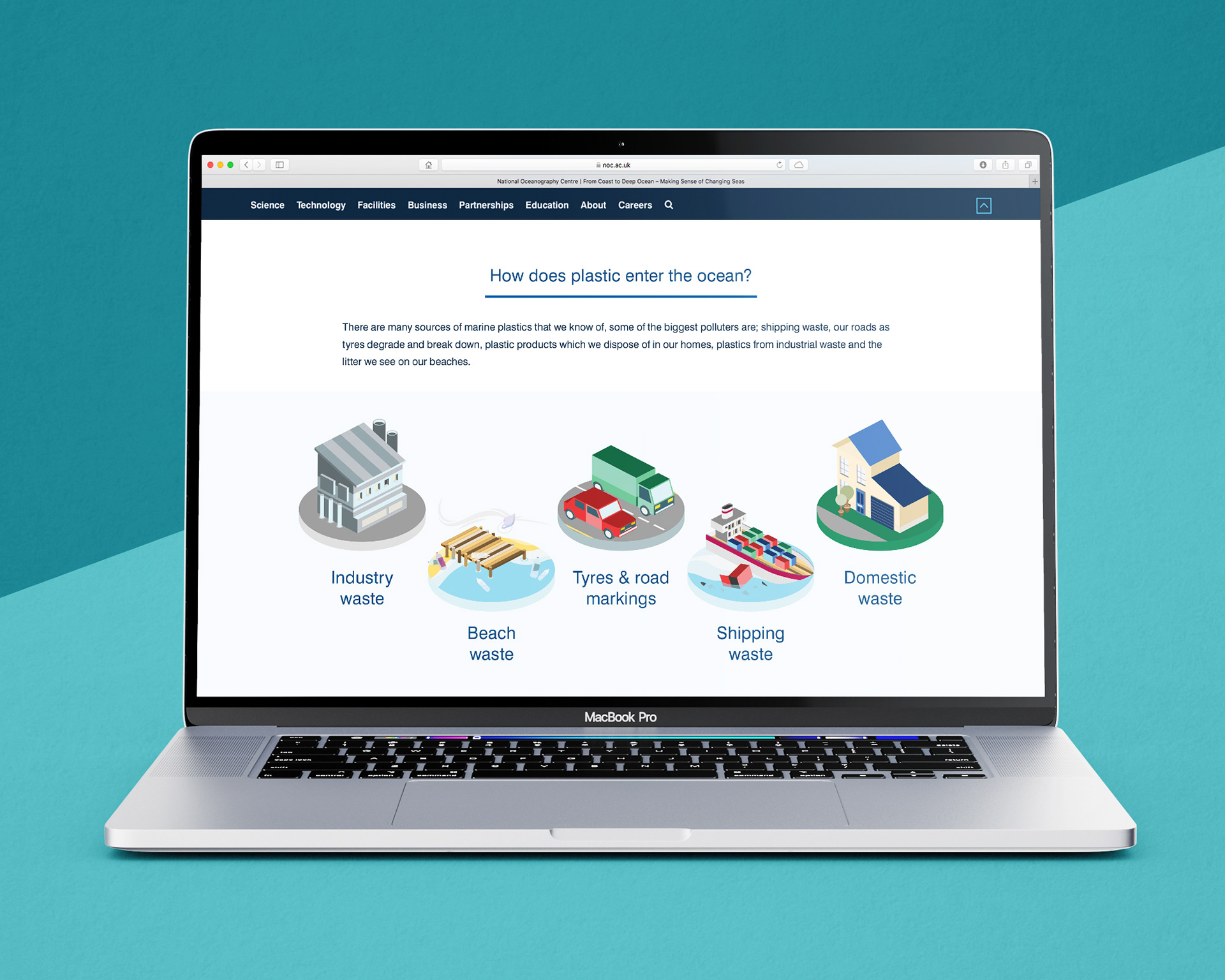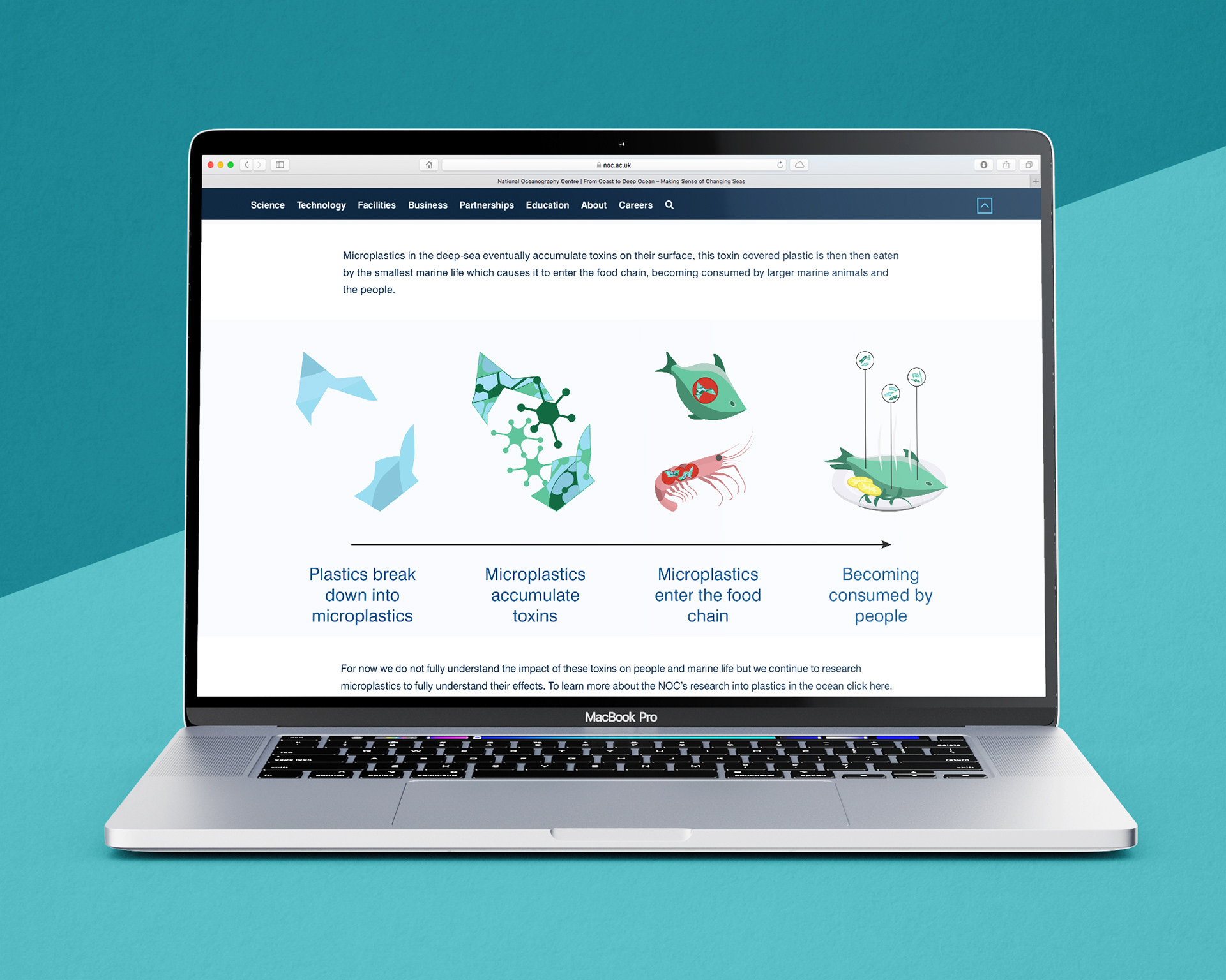 Under the Surface is a new initiative at the National Oceanography Centre, creating a series of resources which explore the ocean in an accessible but informative way. The first one created is about plastics in the ocean. Whilst I do not design the website for the NOC, I occasionally get to collaborate with our web team on initiative such as this, creating assets and layouts for use on the website which we then use in print, social media and at industry events. We went through many iterations to tell the story of plastics in the ocean eventually breaking down the narrative into stages and then key points within each of those. I illustrated them in a step-by-step to make the information as accessible as possible, stripping out any extra details to ensure the message is clear. Combined with carefully crafted text and clear labelling. The final website will be launched shortly.